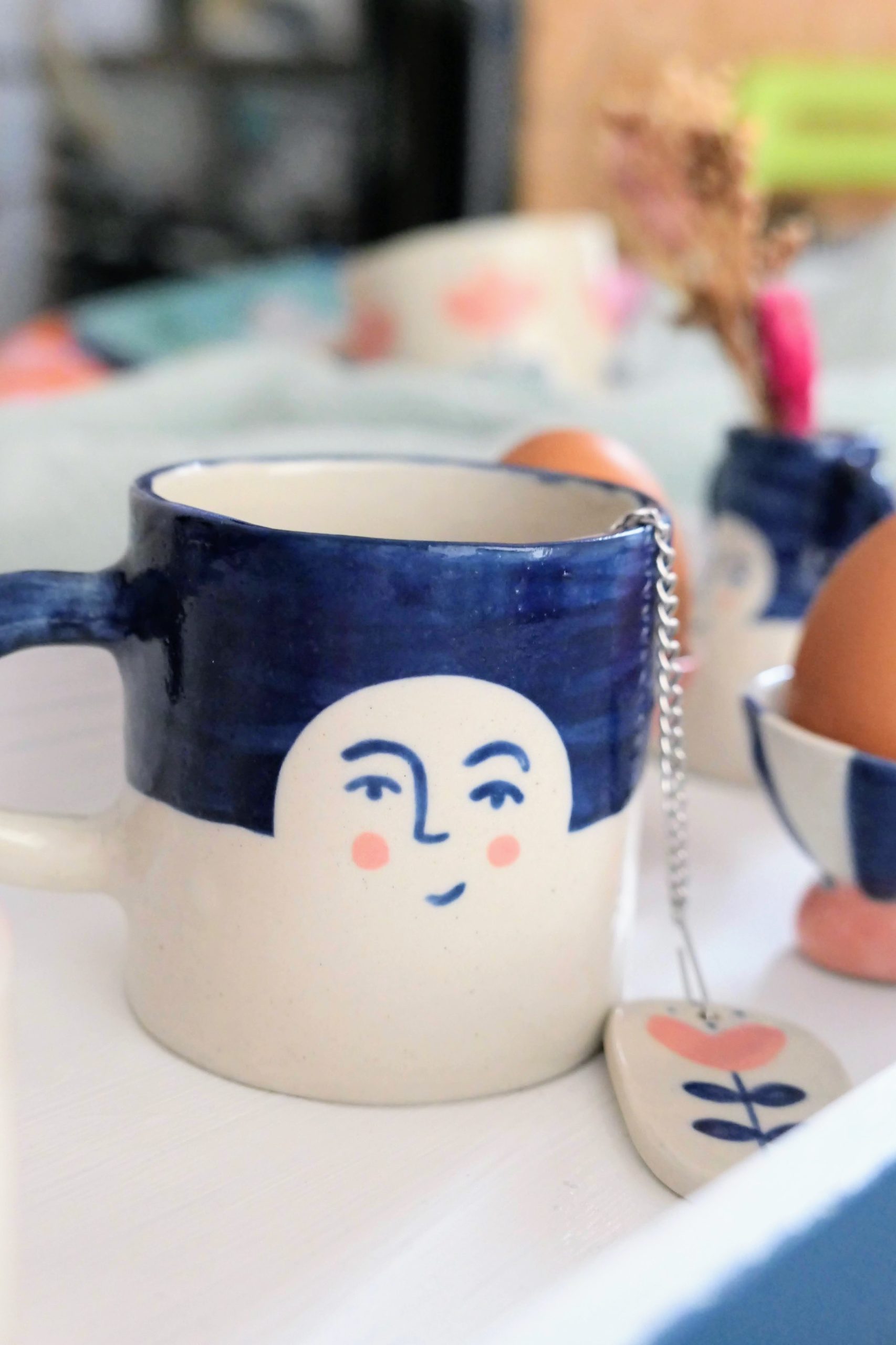 Chaque pièce est unique. Elles sont modelées avec beaucoup d’amour dans un atelier de poterie nantais. Elles sont faites en grès, je peins ensuite dessus avec de l’engobe, pour des belles couleurs. J’ajoute pour finir un émail transparent qui garantit la solidité et la brillance des pièces. Ces pièces sont assez fragiles, comme de la vaisselle !
