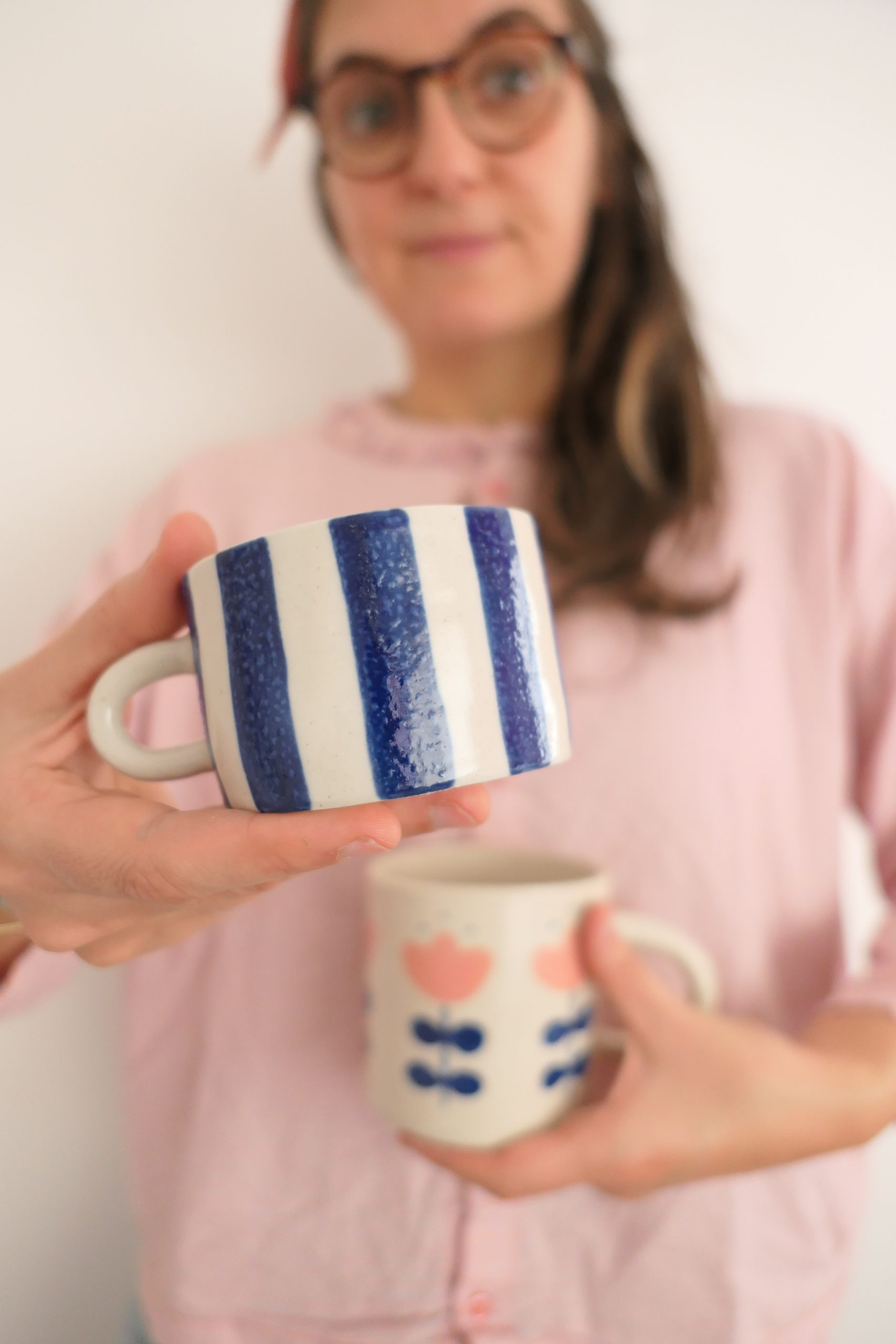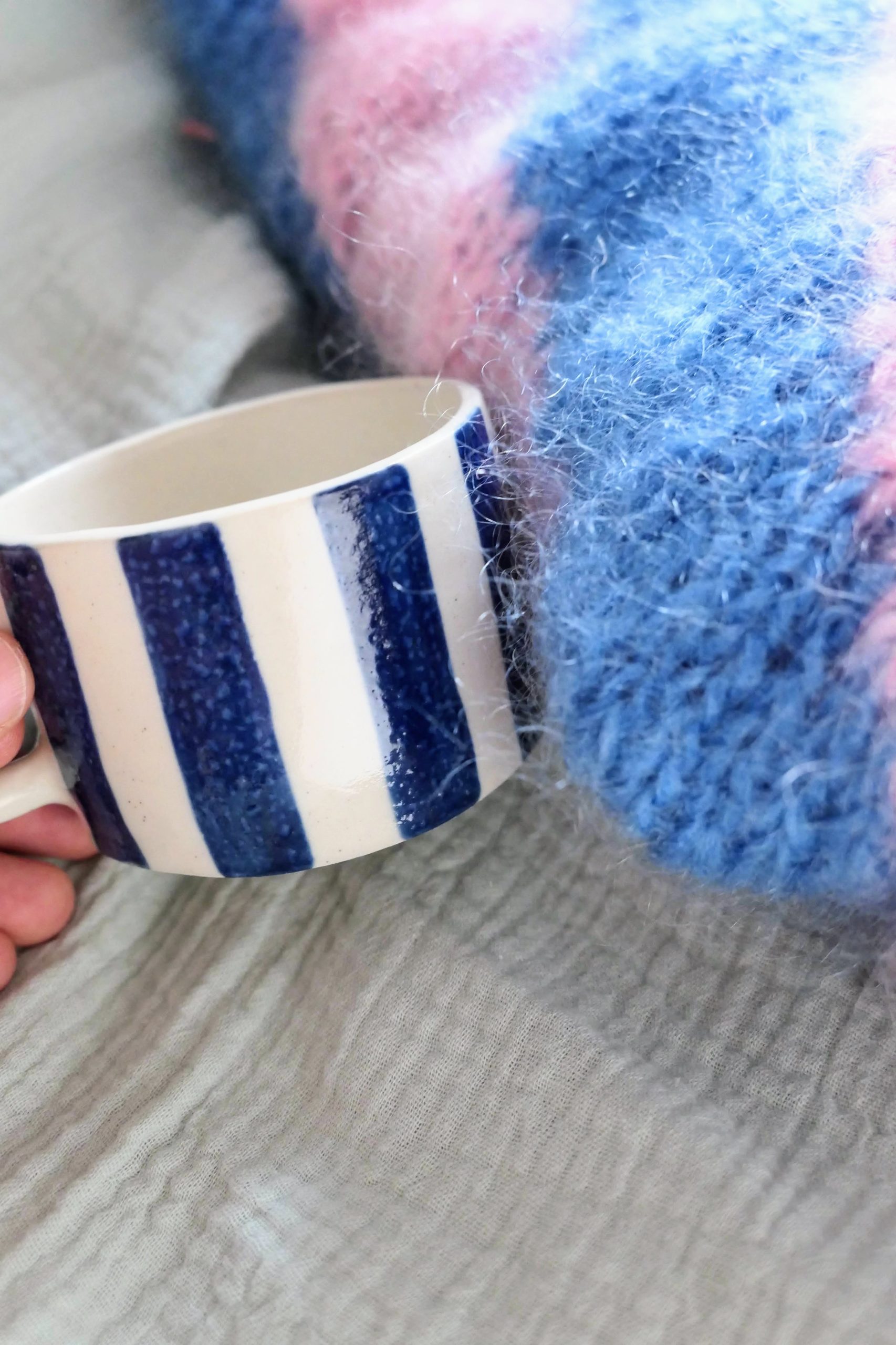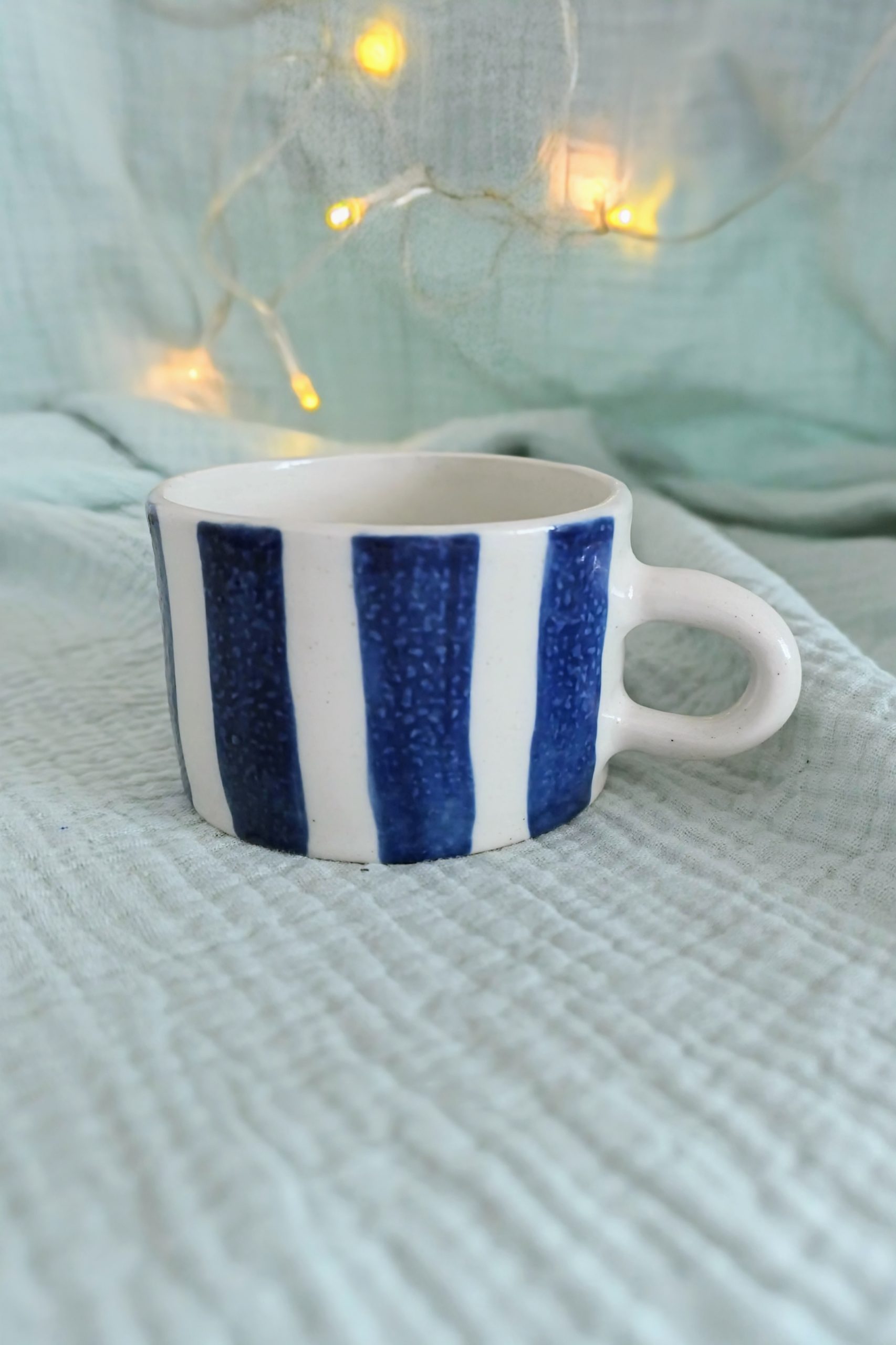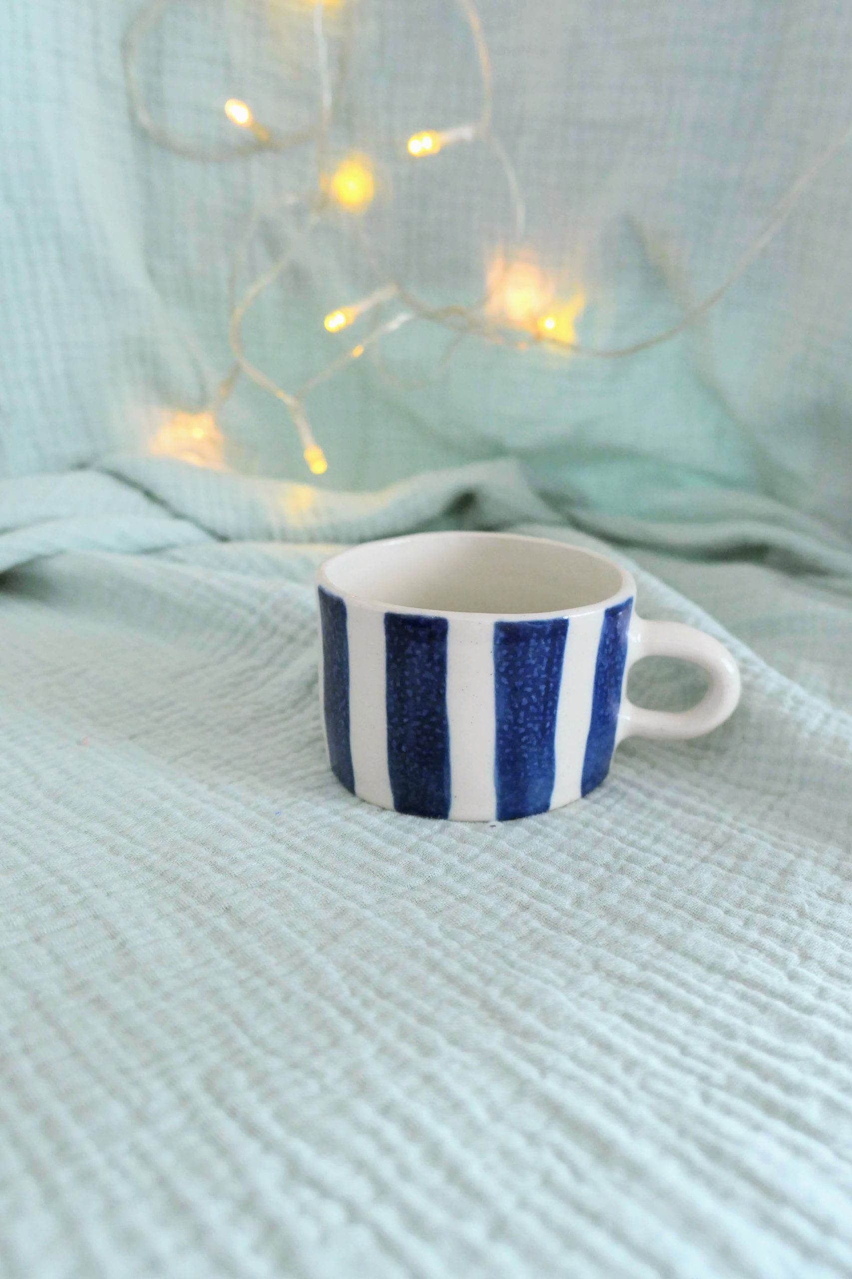 Pour les matins d’hiver où l’on cherche un peu de douceur, cette tasse à motifs rayé bleu, est un petit rituel en soi. Modelée et peinte à la main, elle accompagne vos matins d’hiver.